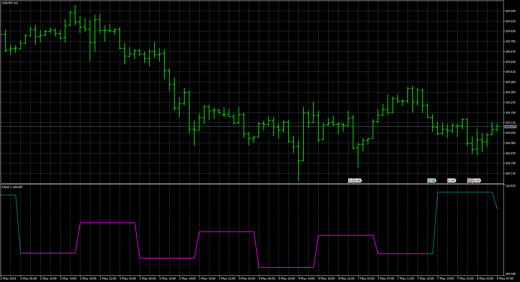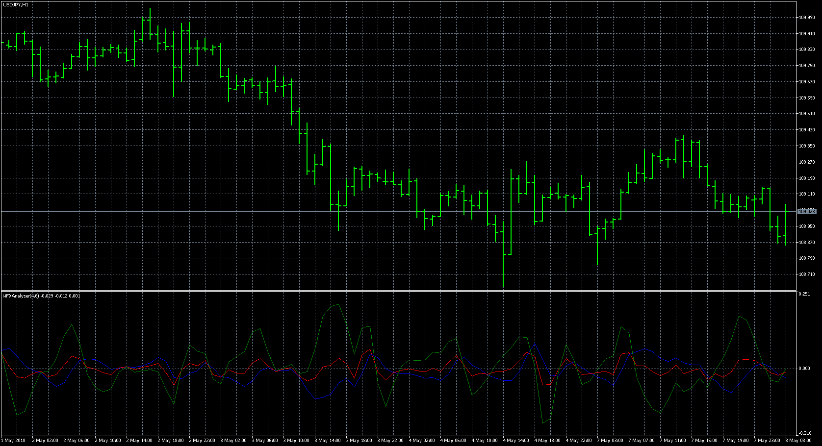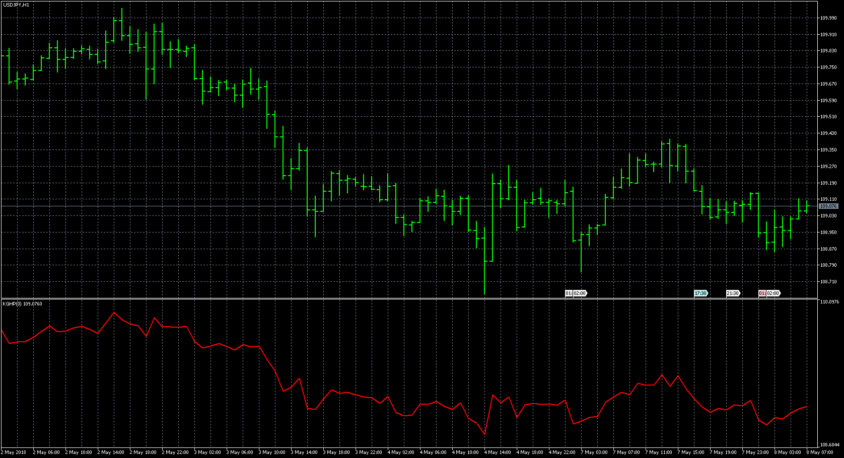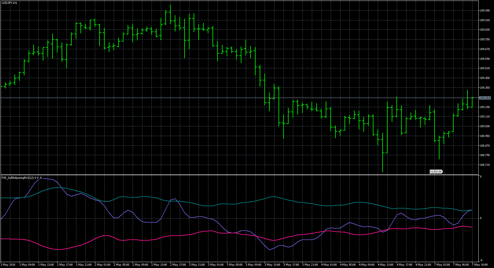 FXのフリーのチャートソフト、メタトレーダー5 (MT5)にインディケーターを表示させた画像です。 画像をクリックすると大きく表示されます。