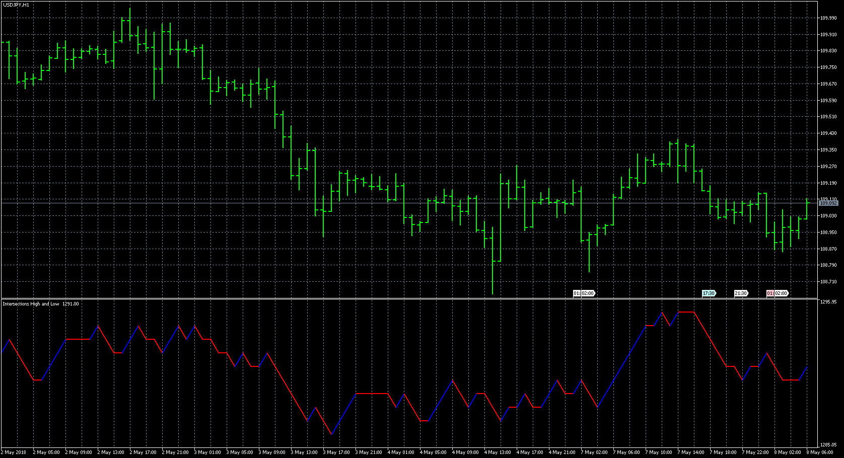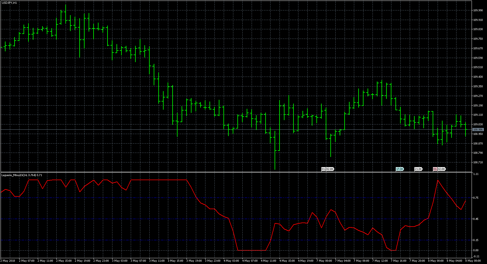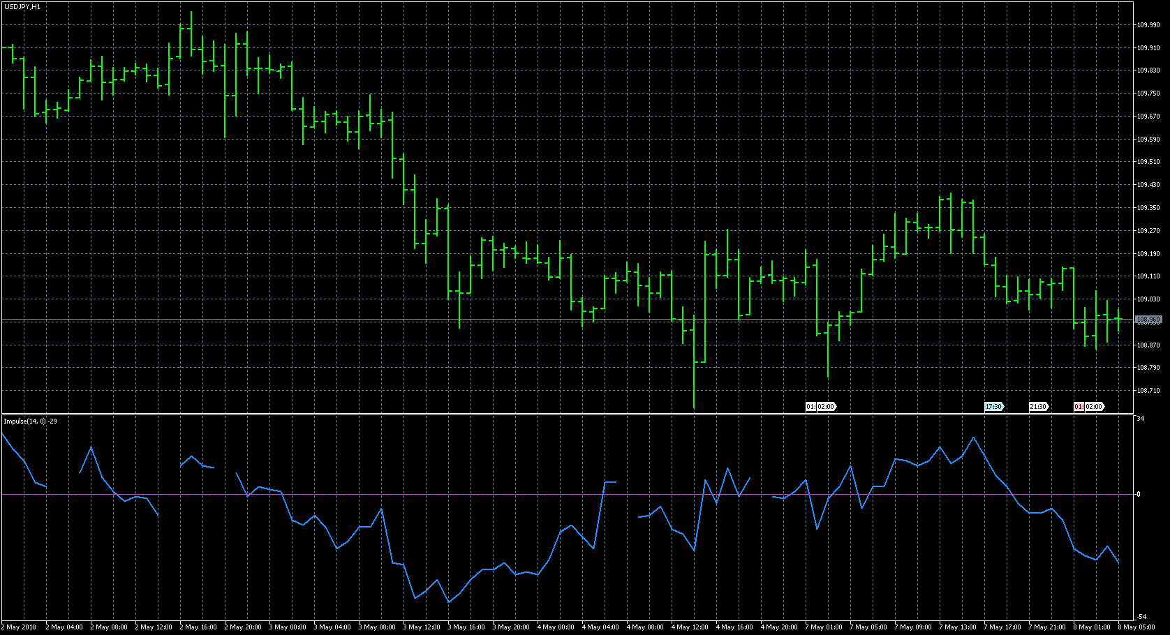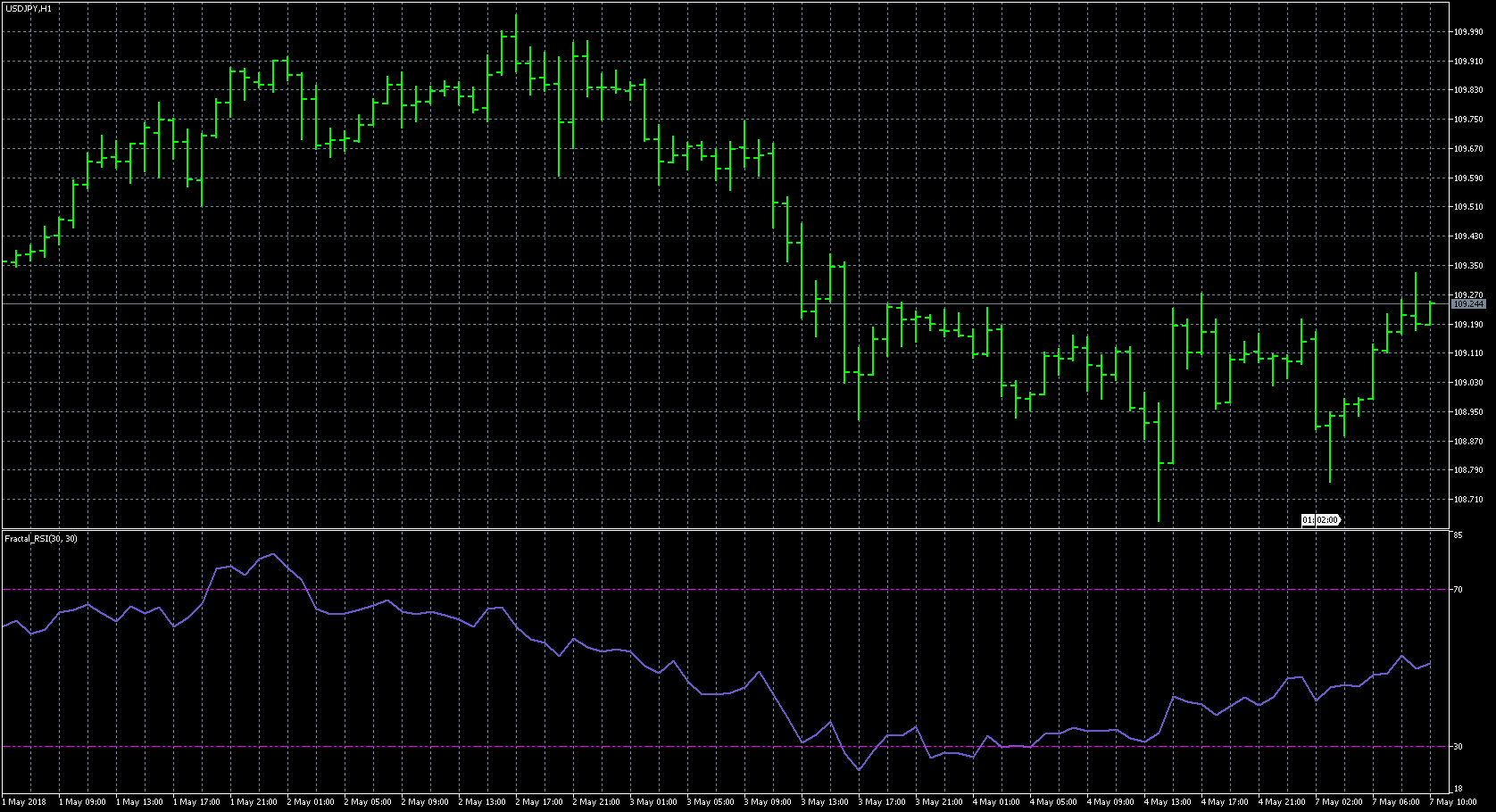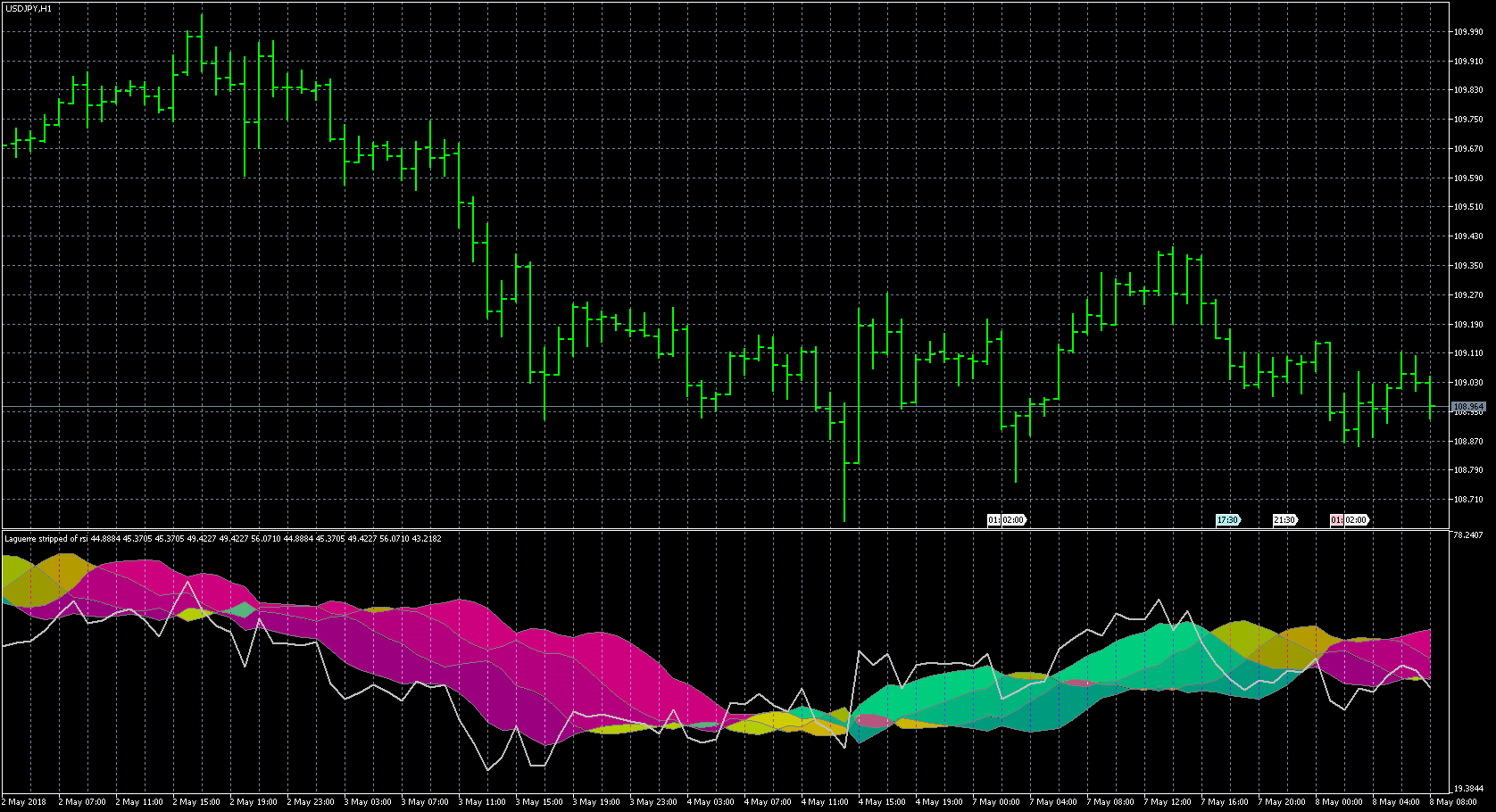 FXのフリーのチャートソフト、メタトレーダー5 (MT5)にインディケーターを表示させた画像です。 画像をクリックすると大きく表示されます。