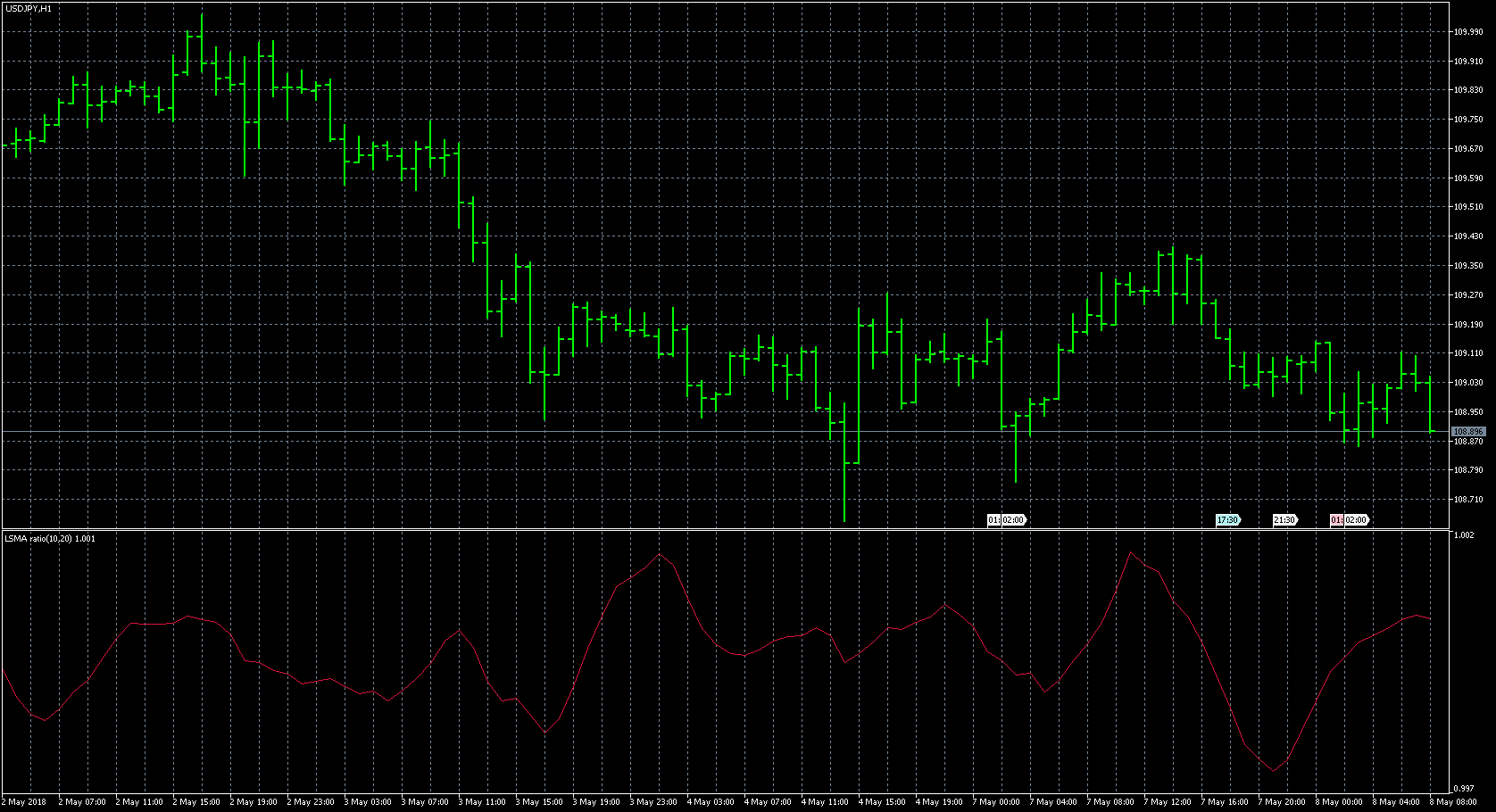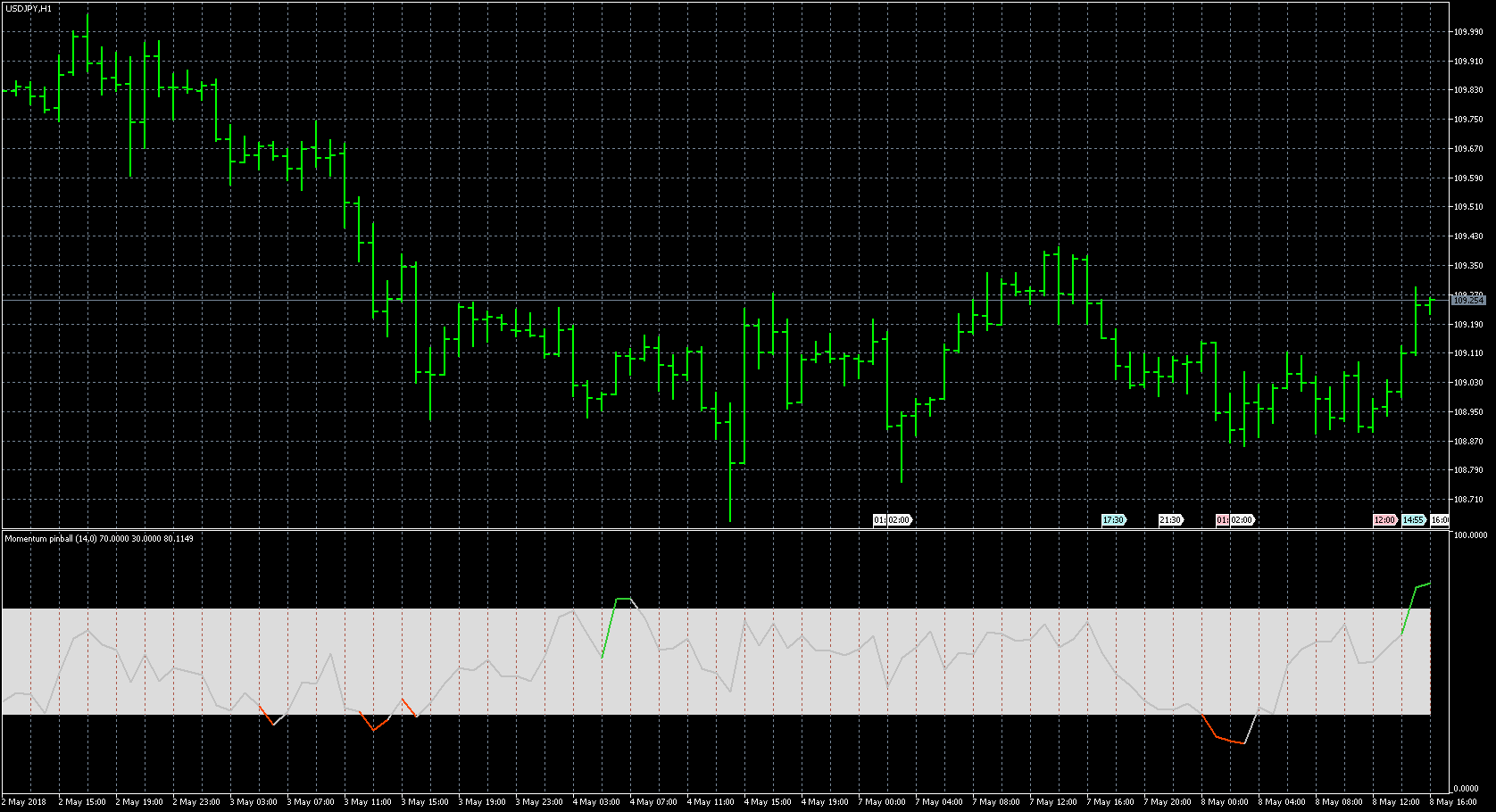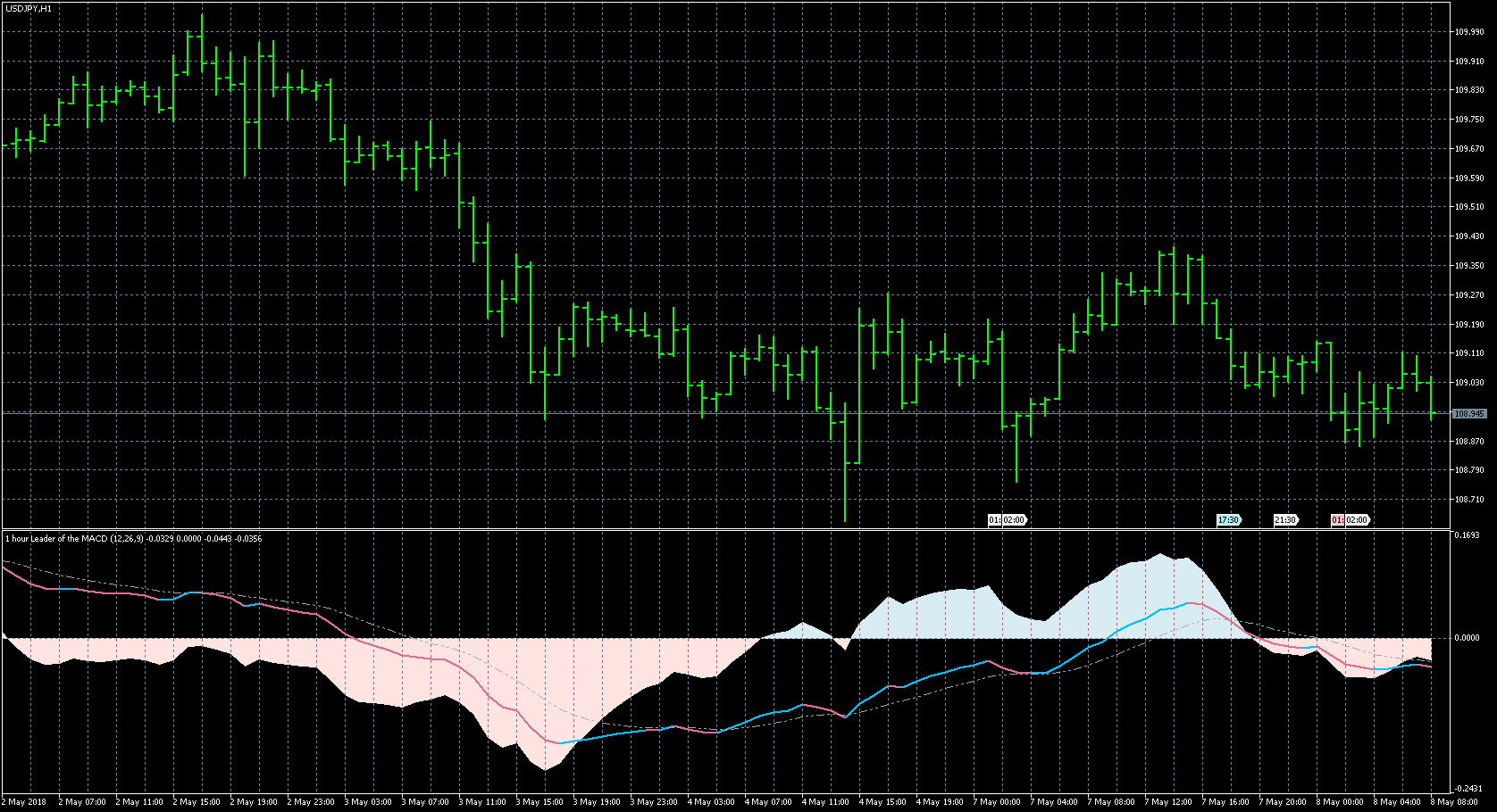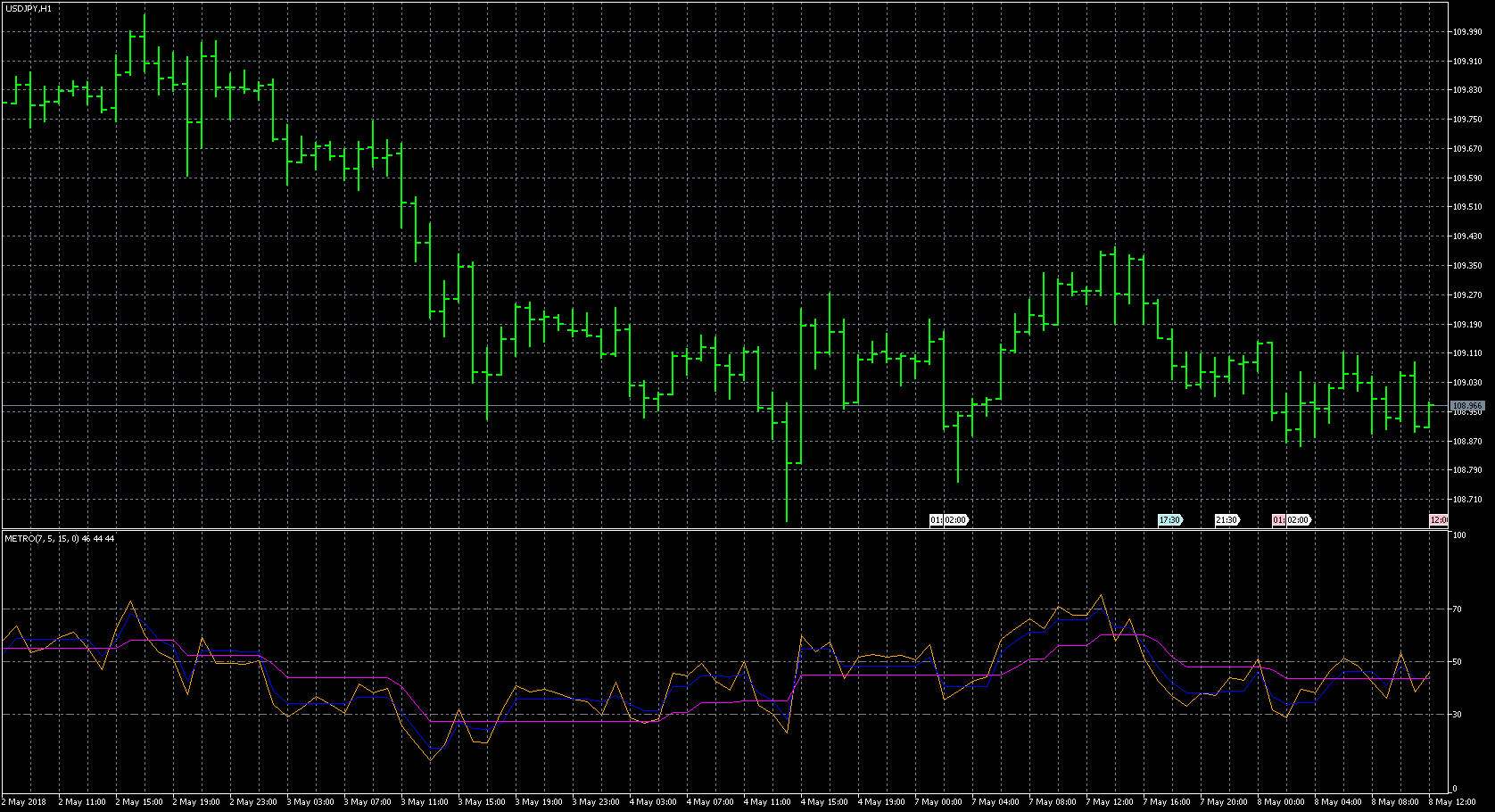FXのフリーのチャートソフト、メタトレーダー5 (MT5)にインディケーターを表示させた画像です。