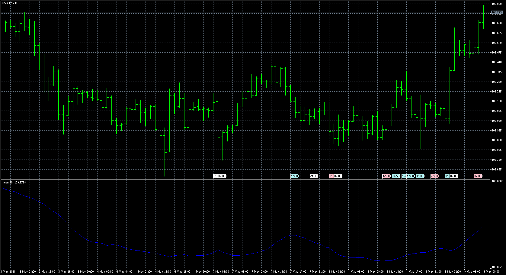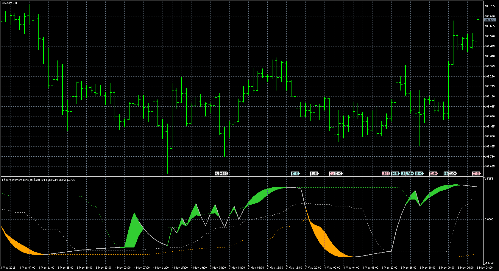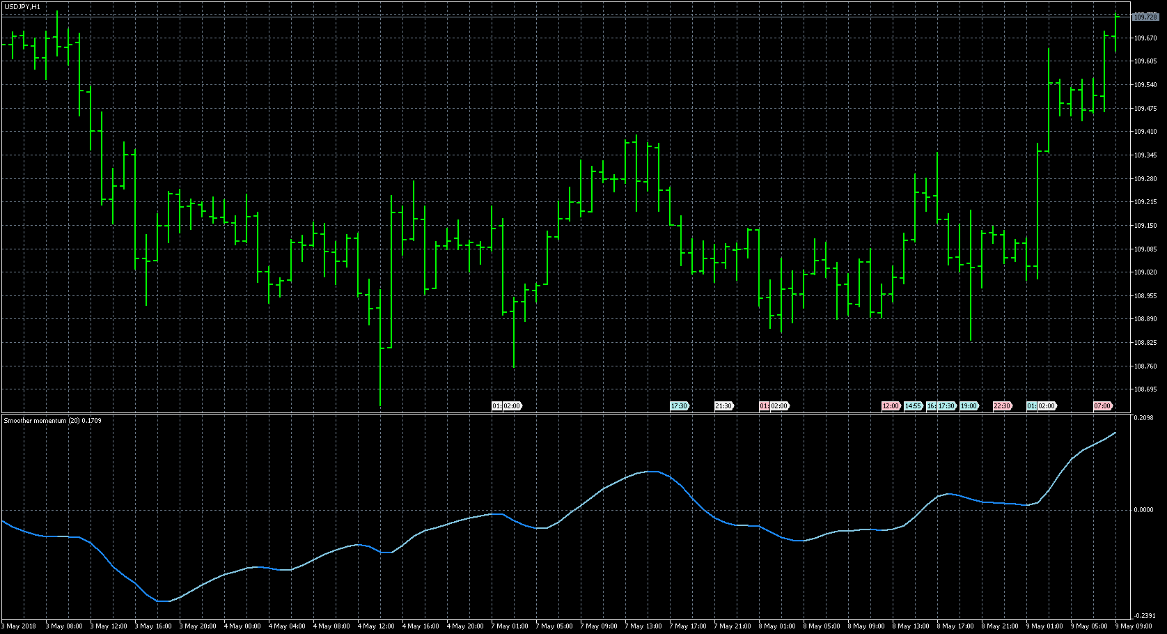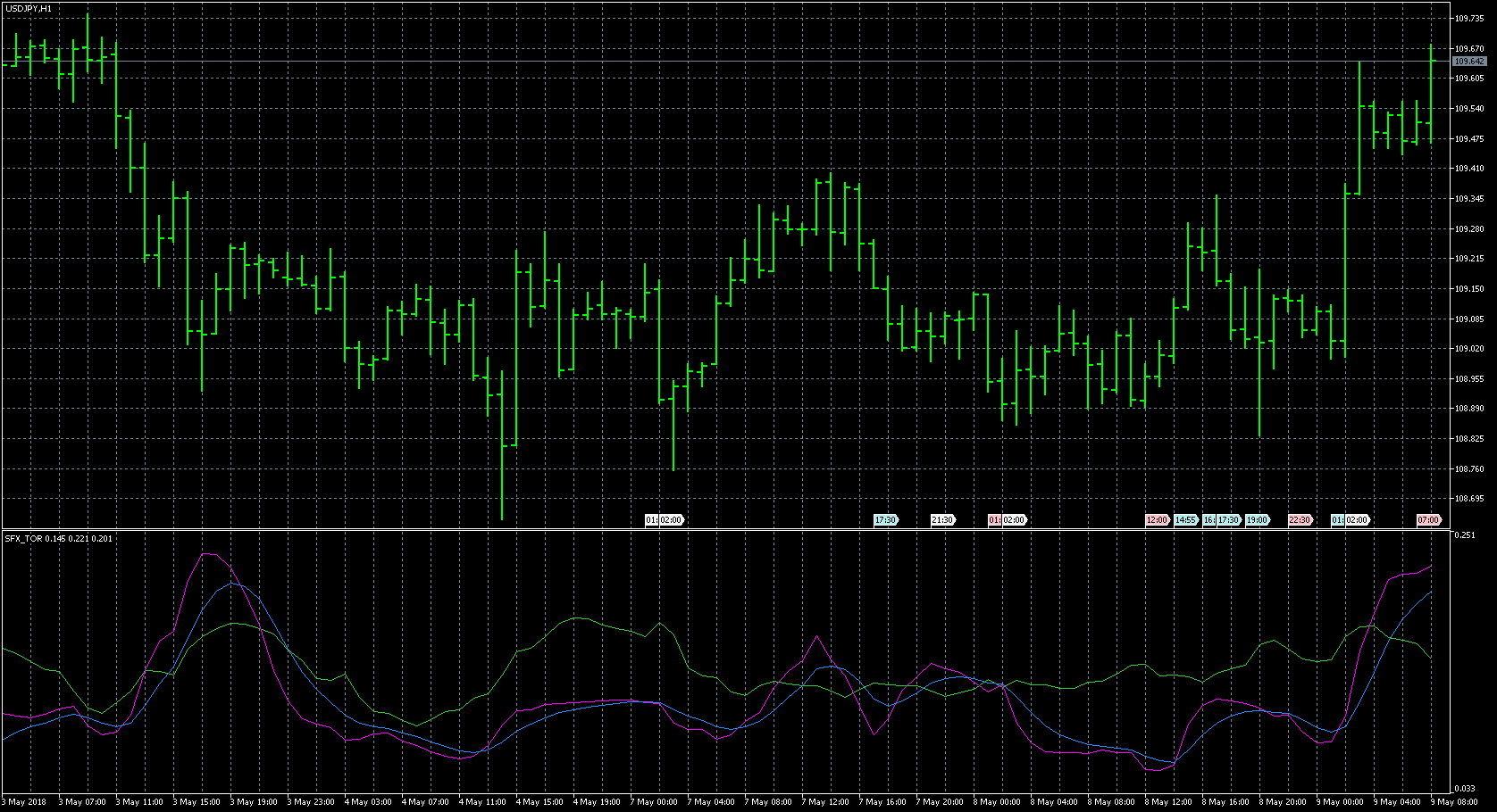 FXのフリーのチャートソフト、メタトレーダー5 (MT5)にインディケーターを表示させた画像です。