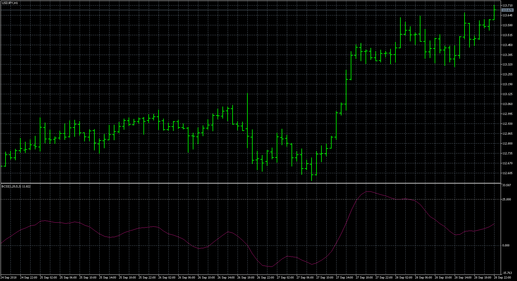 FXのフリーのチャートソフト、メタトレーダー5 (MT5)にインディケーターを表示させた画像です。 画像をクリックすると大きく表示されます。