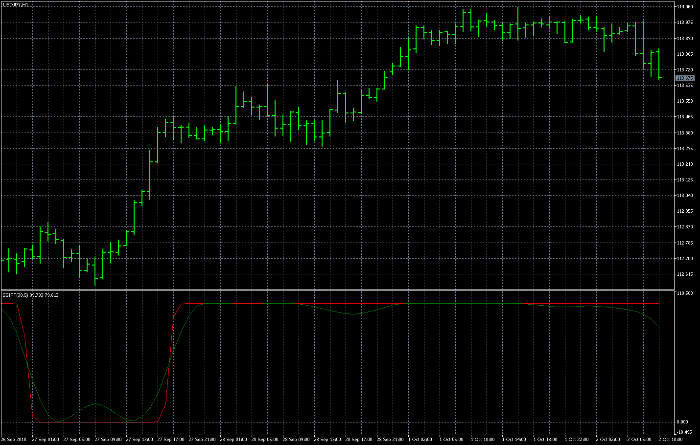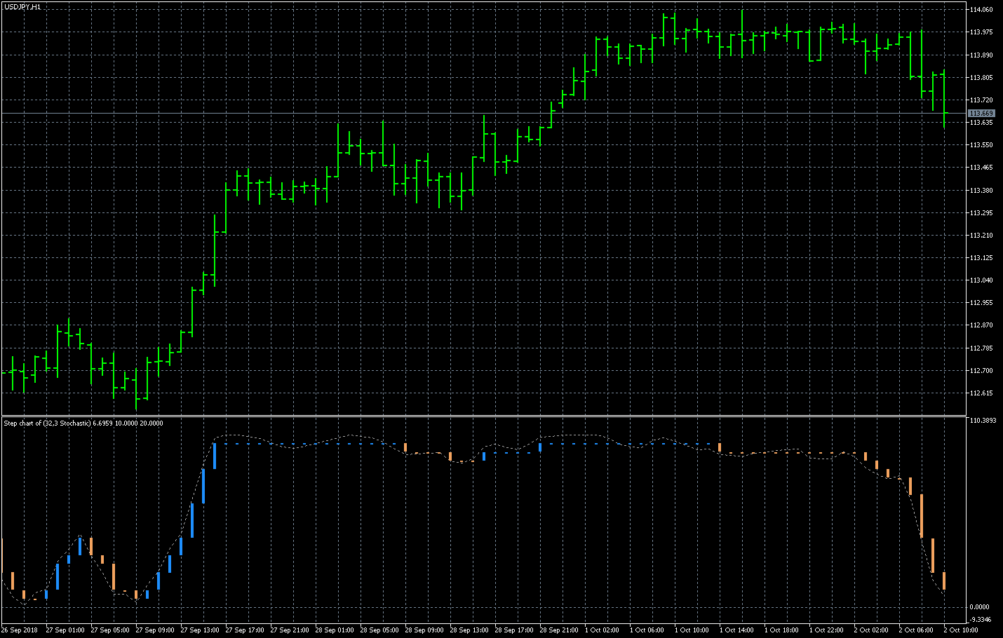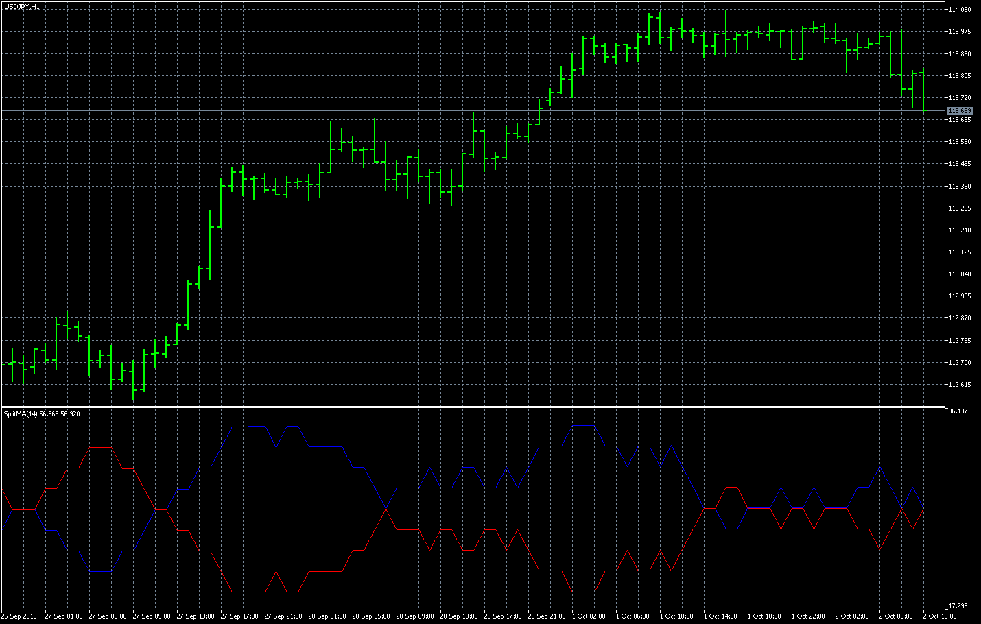 FXのフリーのチャートソフト、メタトレーダー5 (MT5)にインディケーターを表示させた画像です。