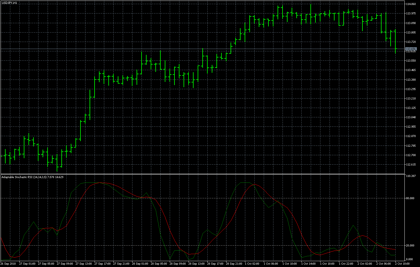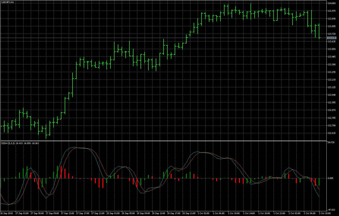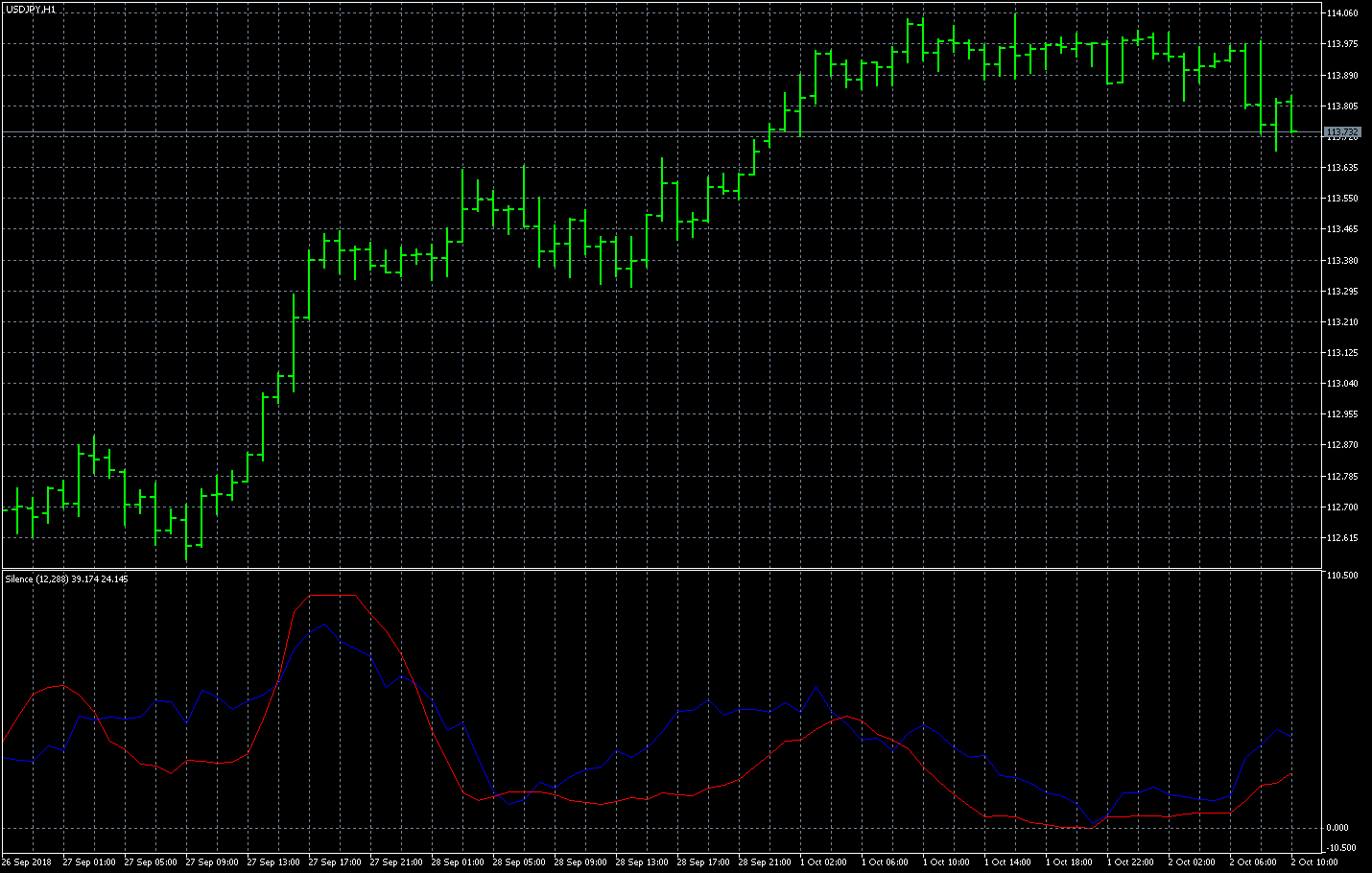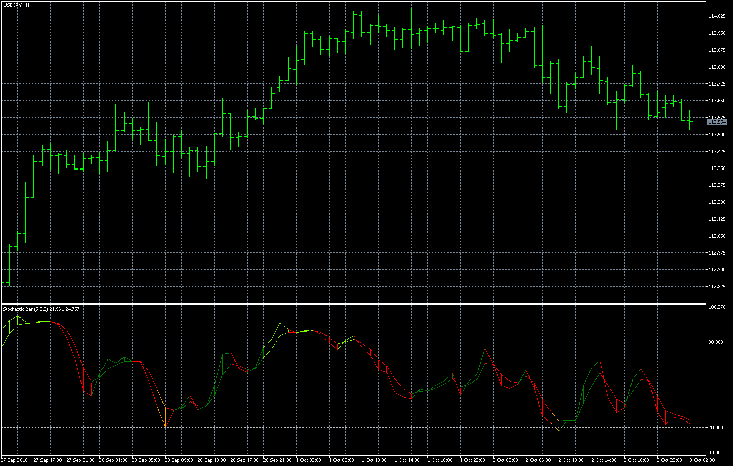 FXのフリーのチャートソフト、メタトレーダー5 (MT5)にインディケーターを表示させた画像です。
