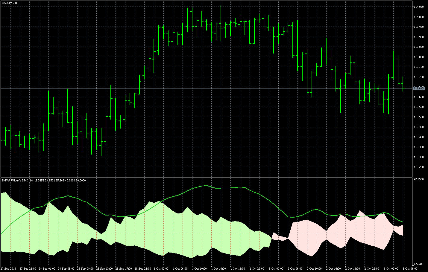 FXのフリーのチャートソフト、メタトレーダー5 (MT5)にインディケーターを表示させた画像です。 画像をクリックすると大きく表示されます。