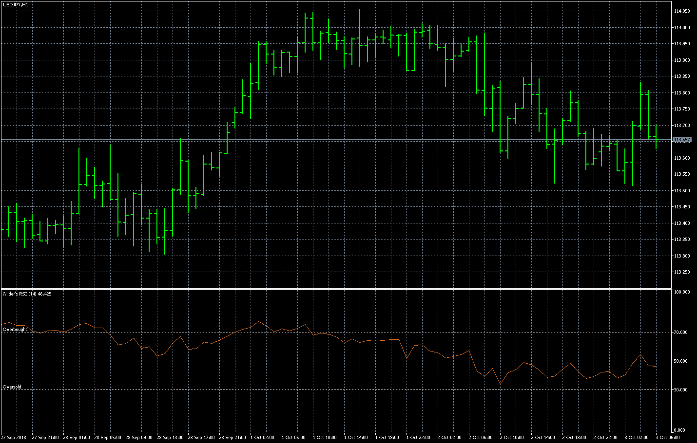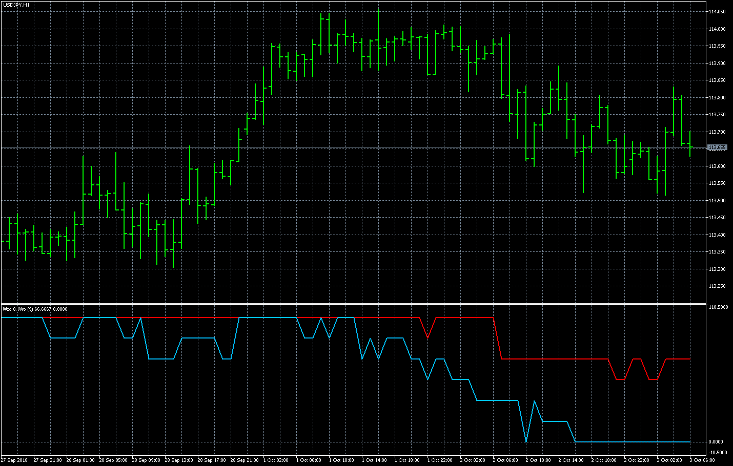FXのフリーのチャートソフト、メタトレーダー5 (MT5)にインディケーターを表示させた画像です。 画像をクリックすると大きく表示されます。