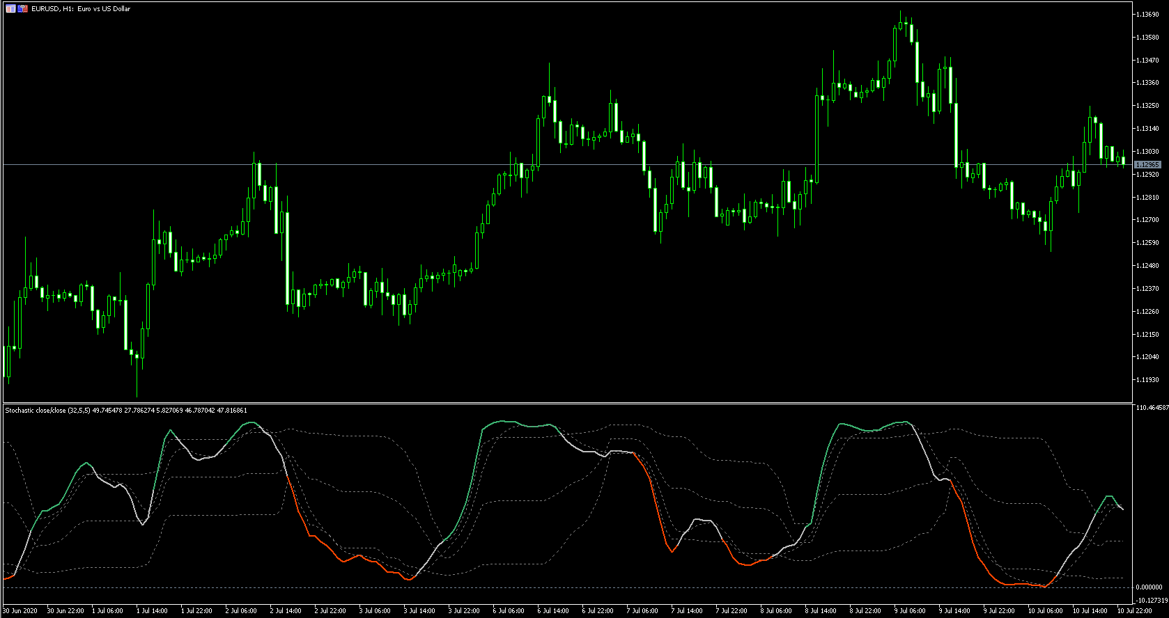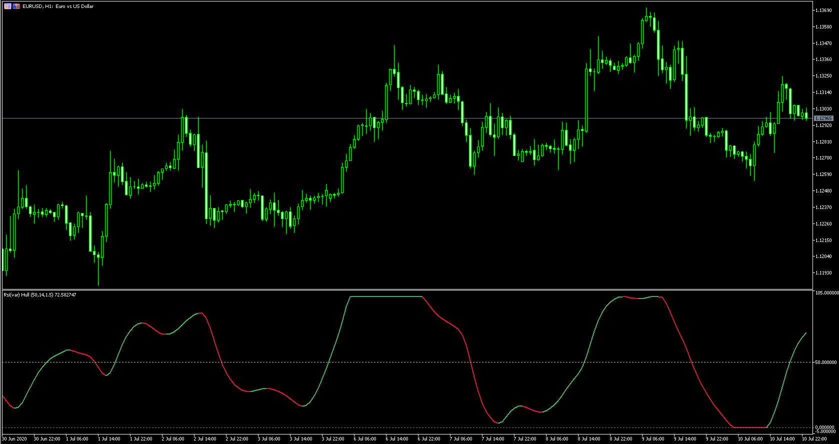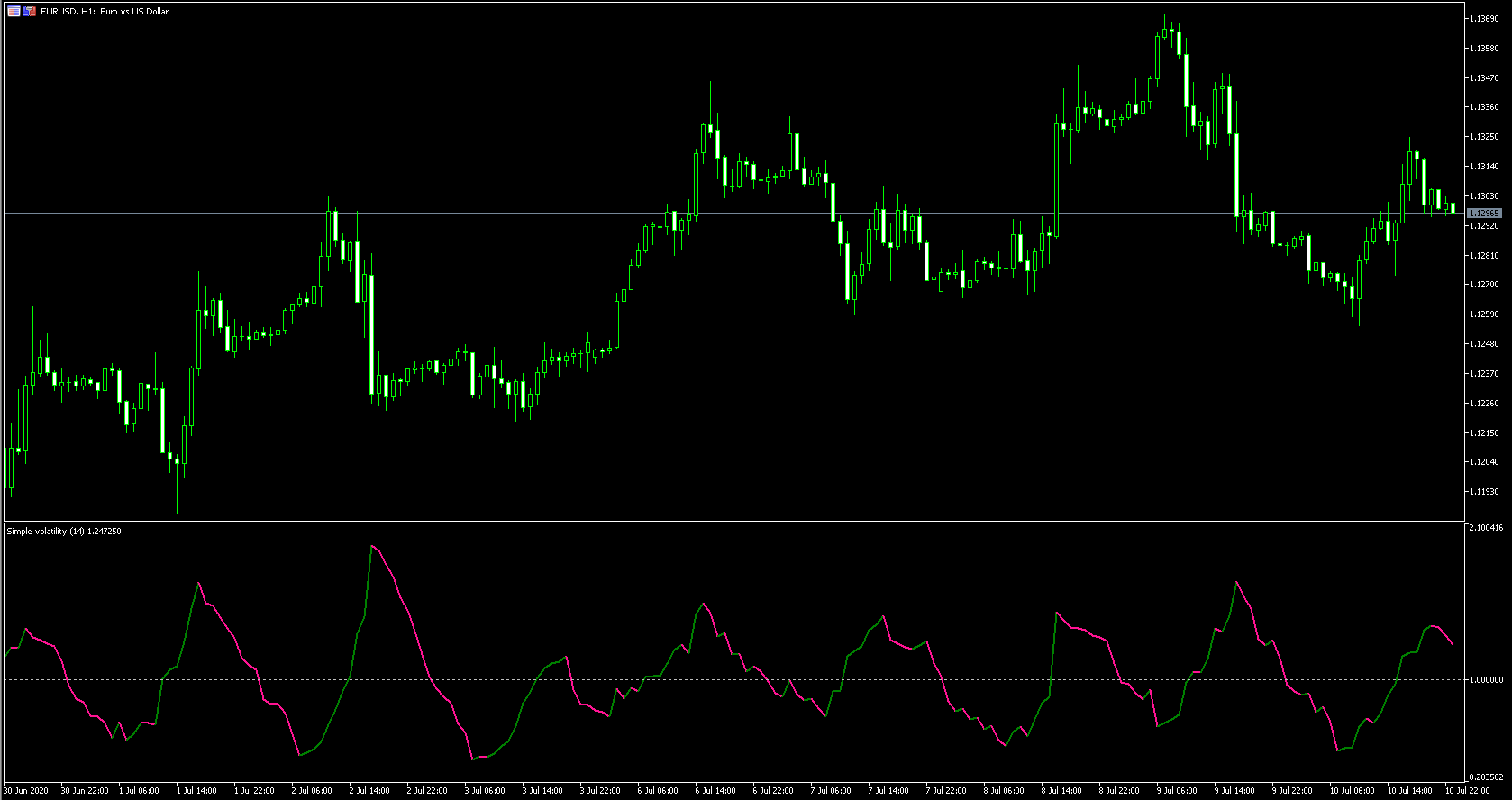 FXのフリーのチャートソフト、メタトレーダー5 (MT5)にインディケーターを表示させた画像です。