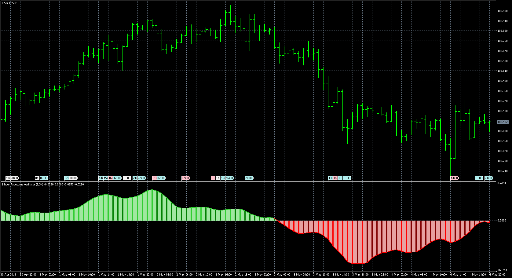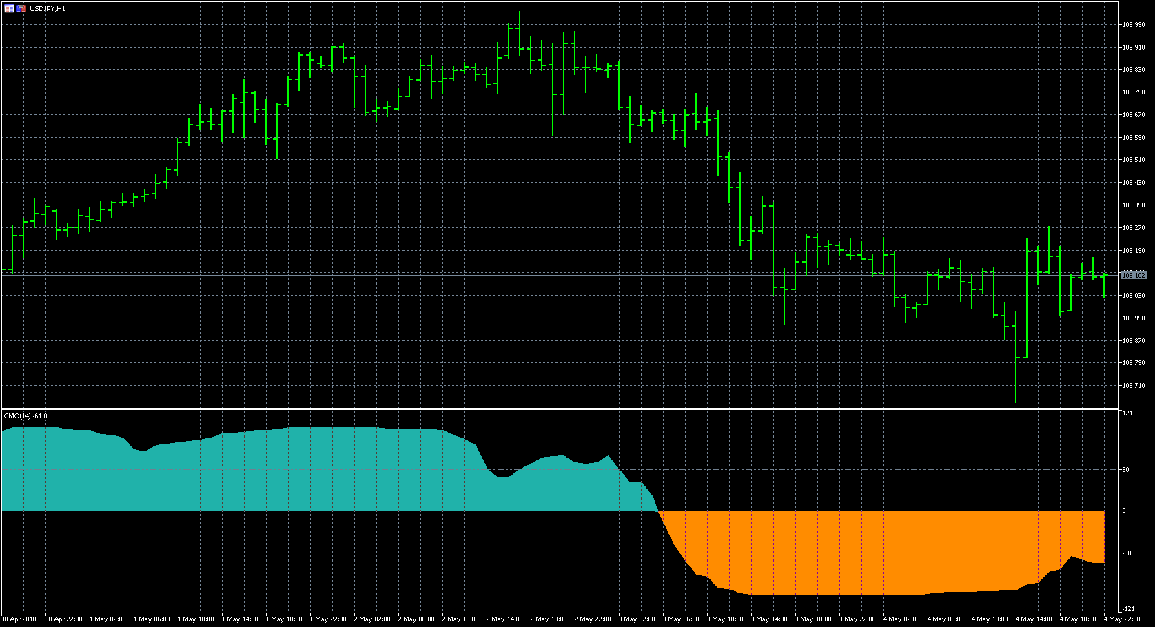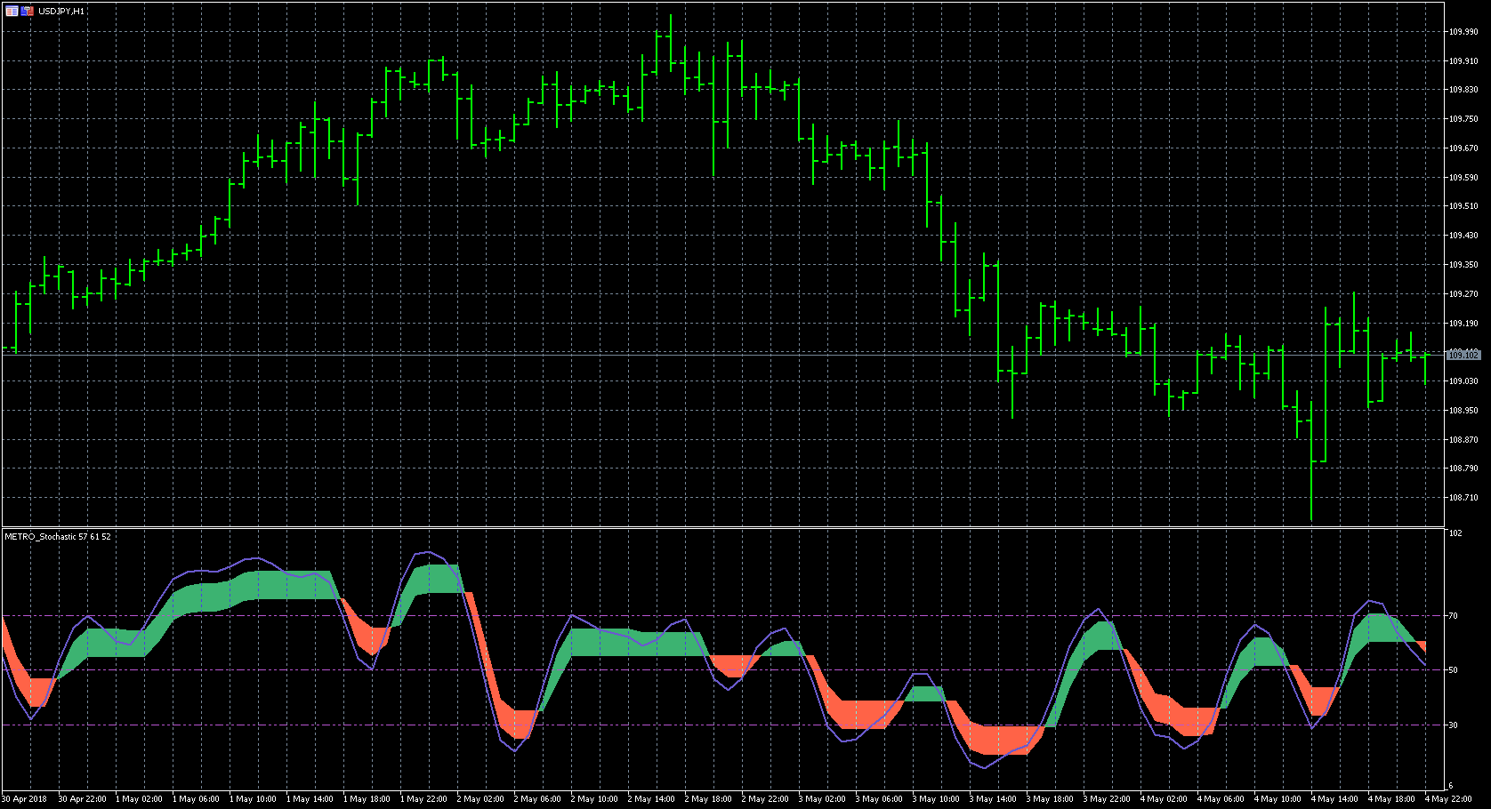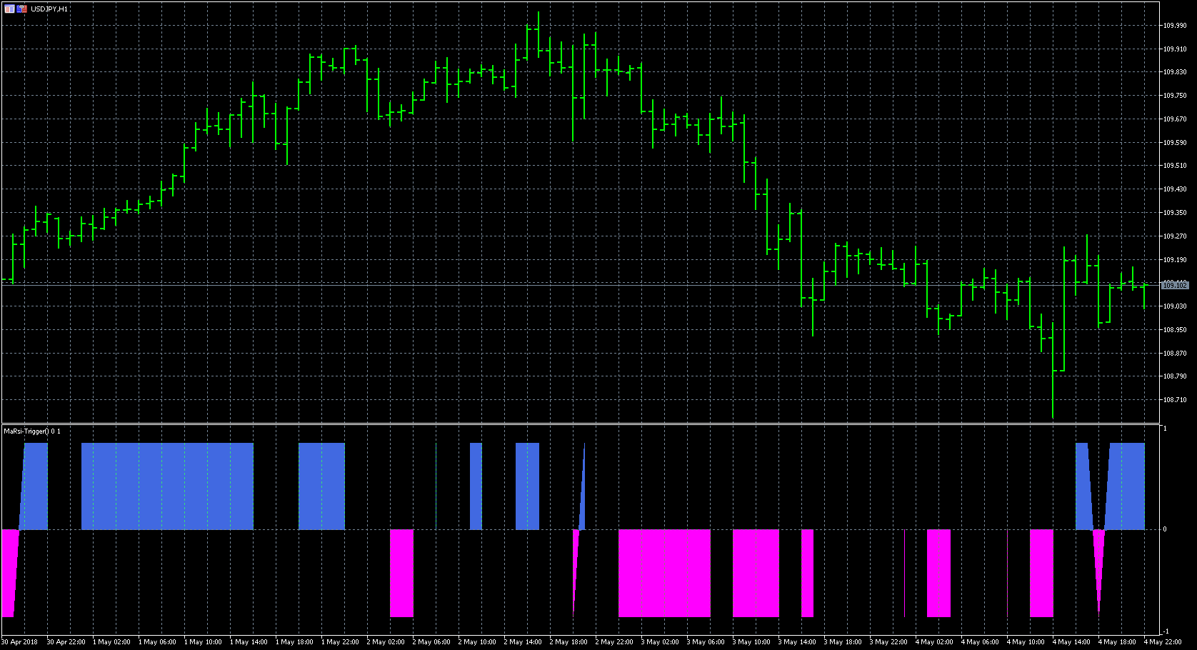 FXのフリーのチャートソフト、メタトレーダー5 (MT5)にインディケーターを表示させた画像です。