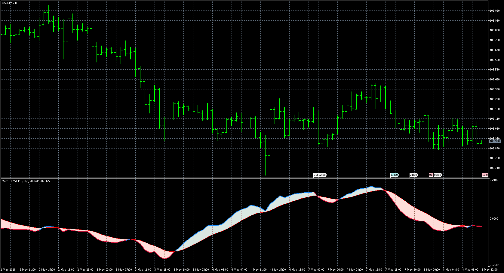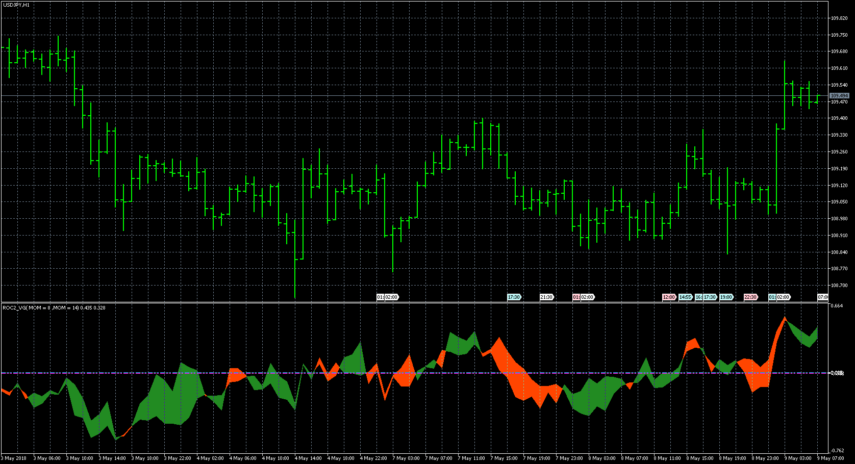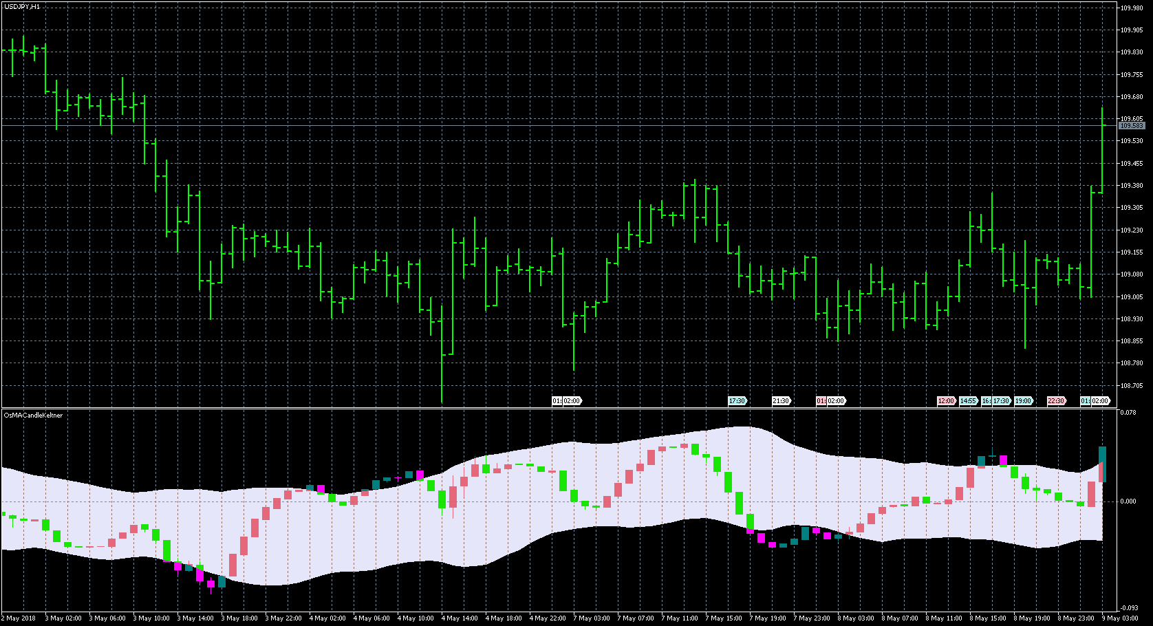 FXのフリーのチャートソフト、メタトレーダー5 (MT5)にインディケーターを表示させた画像です。