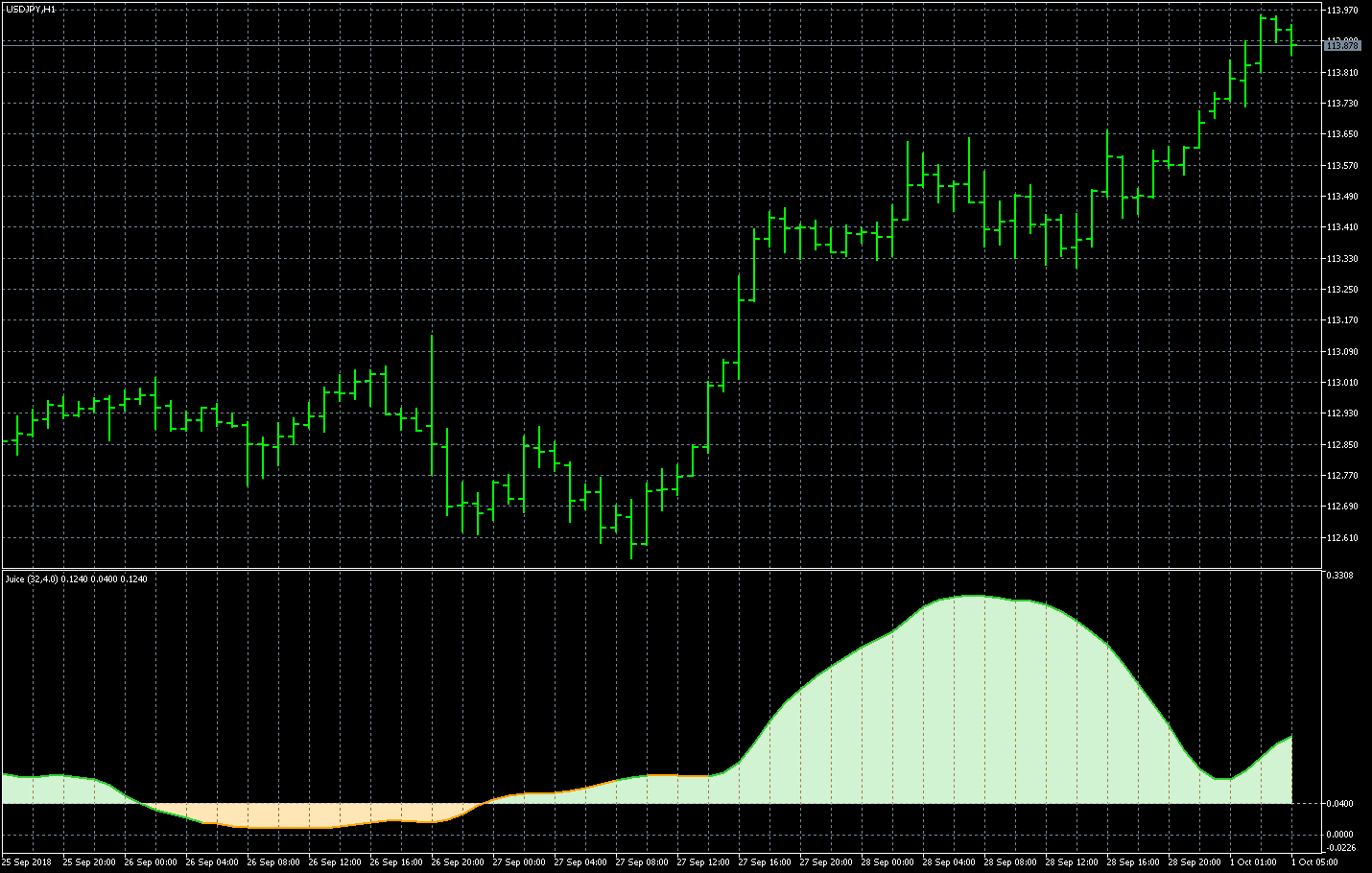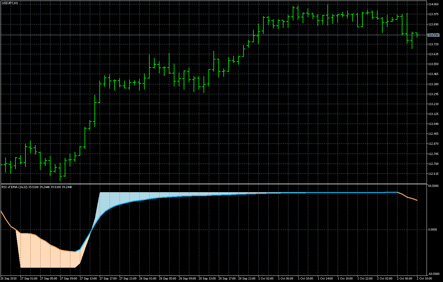 FXのフリーのチャートソフト、メタトレーダー5 (MT5)にインディケーターを表示させた画像です。