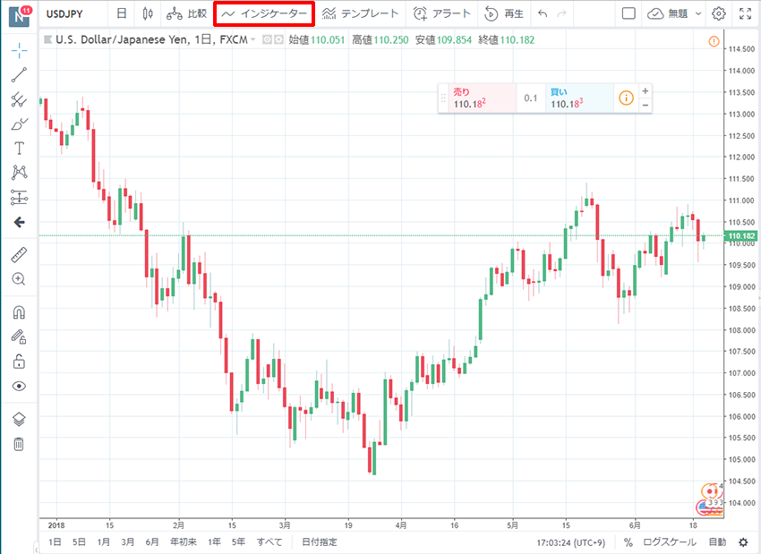 ①TradingView上部にある「インジケーター」ボタンをクリックします。