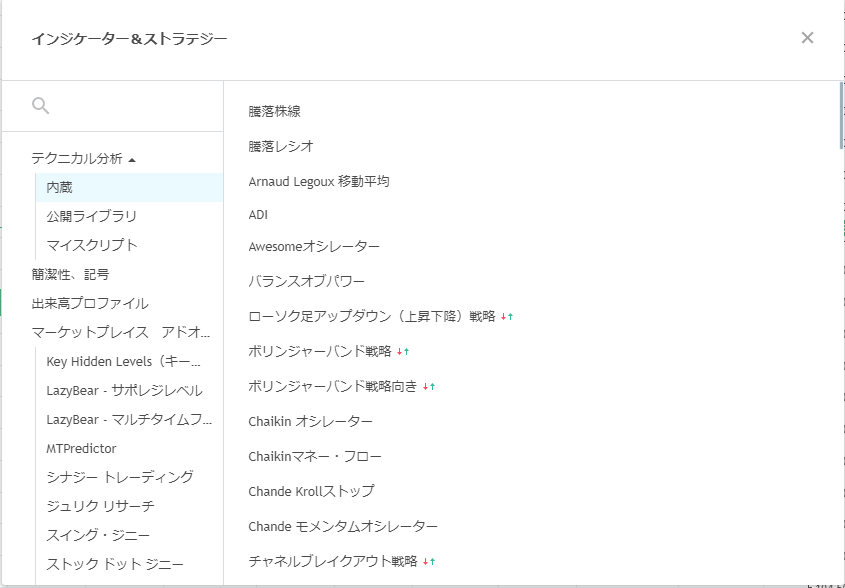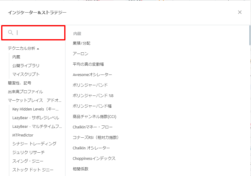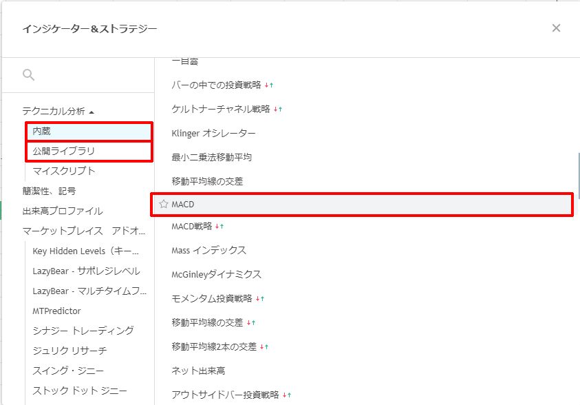 ③「内蔵」もしくは「公開ライブラリ」を選んで、目的のインジケーターが現れるまでスクロールします。