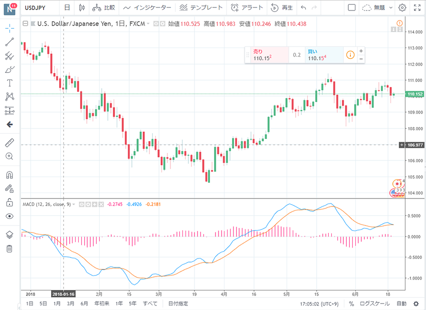 ④右上の「✕」をクリックするか、チャート上をクリックすると「インジケーター&ストラテジー」ボックスが消えます。