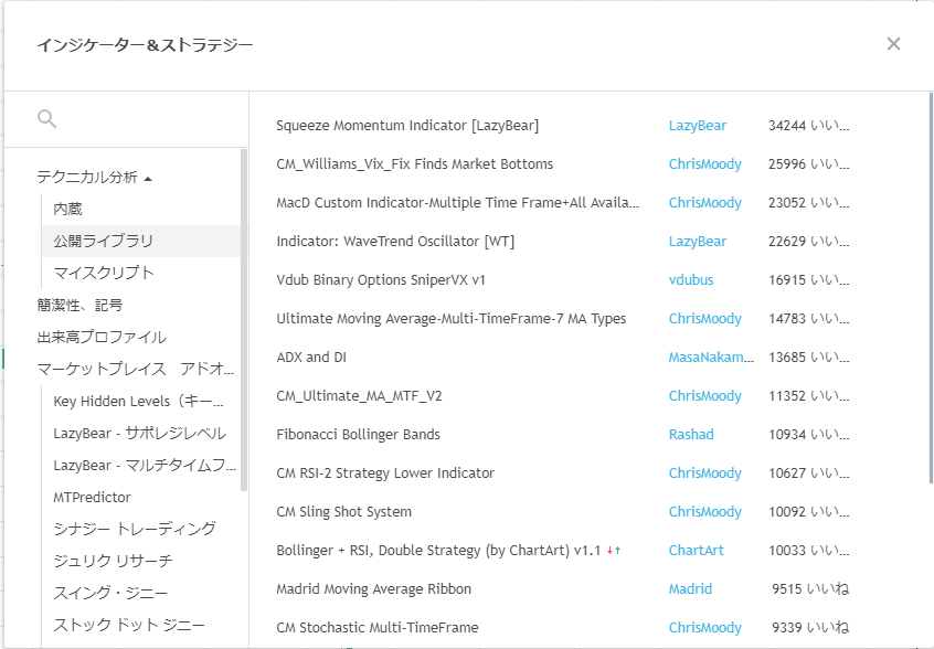 ⑥ちなみに、公開ライブラリのインディケーターはたくさんありますので、スクロールして探すのは大変です。