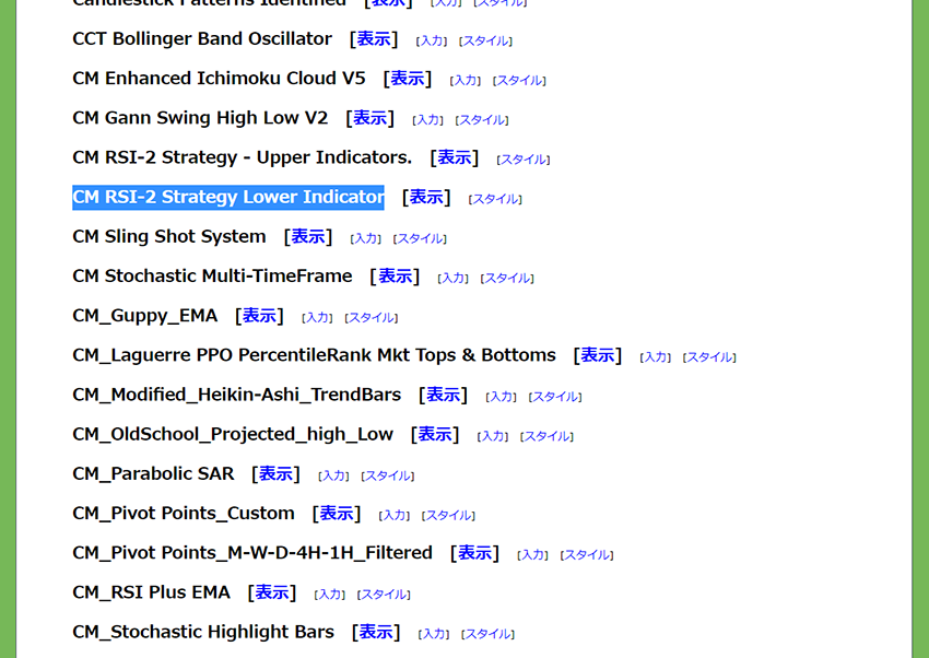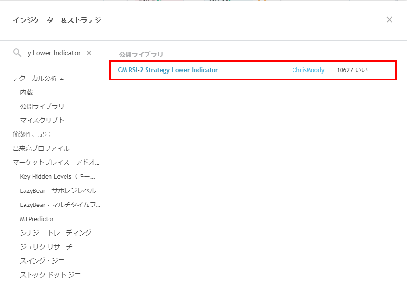 ここでは、公開ライブラリのインディケーター「CM RSI-2 Strategy Lower Indicator」を選びます。