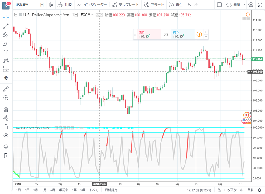 ⑩チャートに、インディケーター「CM RSI-2 Strategy Lower Indicator」が表示されました。