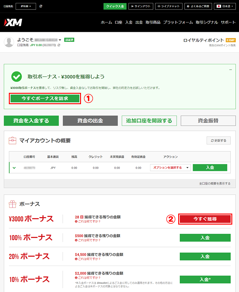 取引ボーナスの受け取り手順