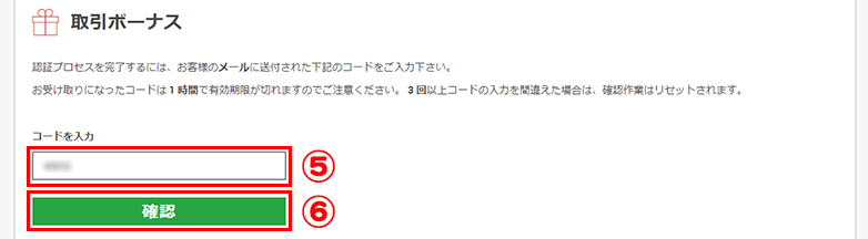 数字5桁の認証コードが記載されています。これをコピーして、さきほどの取引ボーナスページに戻ります。