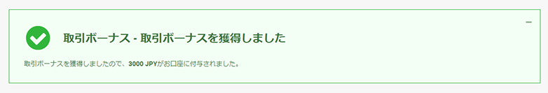 口座を有効化したあとに簡単な手続きをすると、すぐに取引口座に3,000円分が反映されます。
